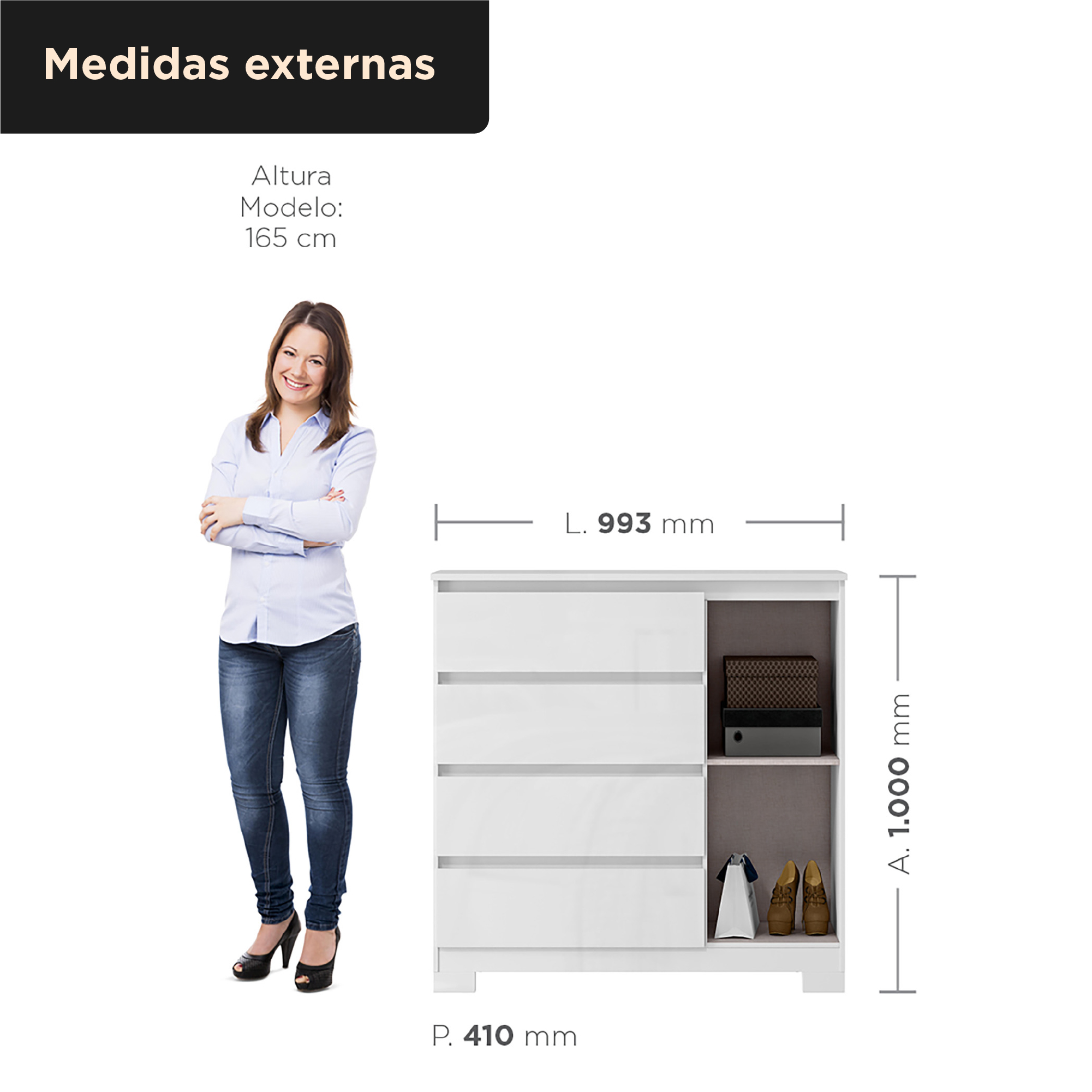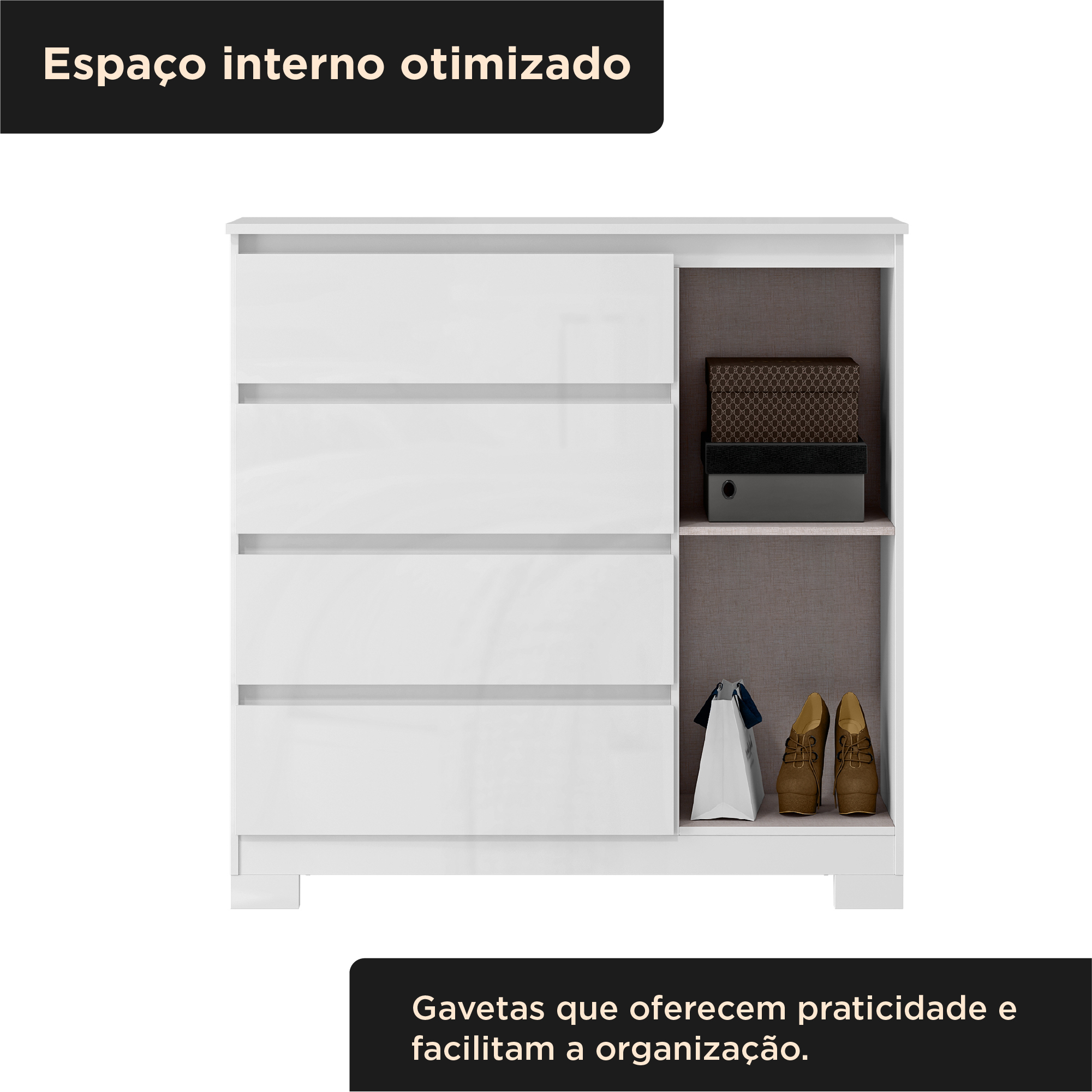 Com 4 gavetas espaçosas e uma porta pivotante que da acesso a um amplo espaço interno, você consegue unir organização e personalidade em um único móvel.