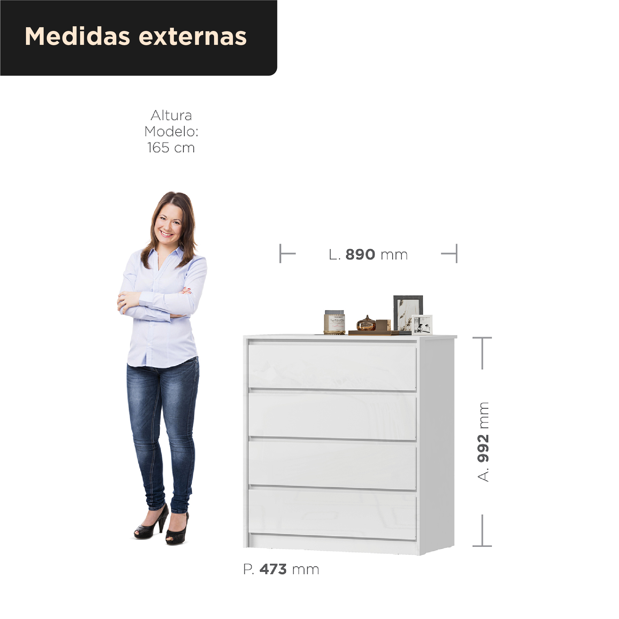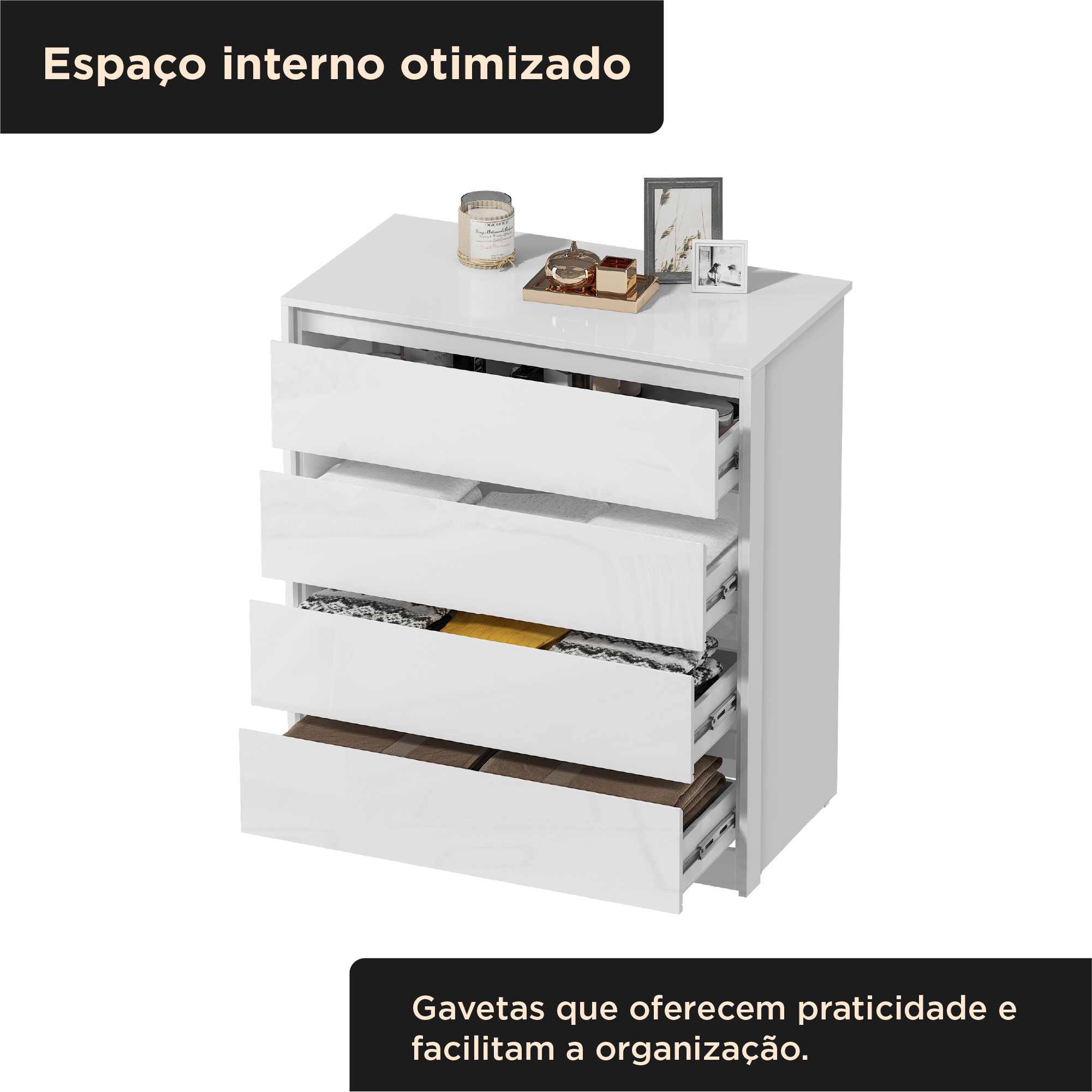 Cômoda 4 gavetas grandes Carla - branco neve / branco neve