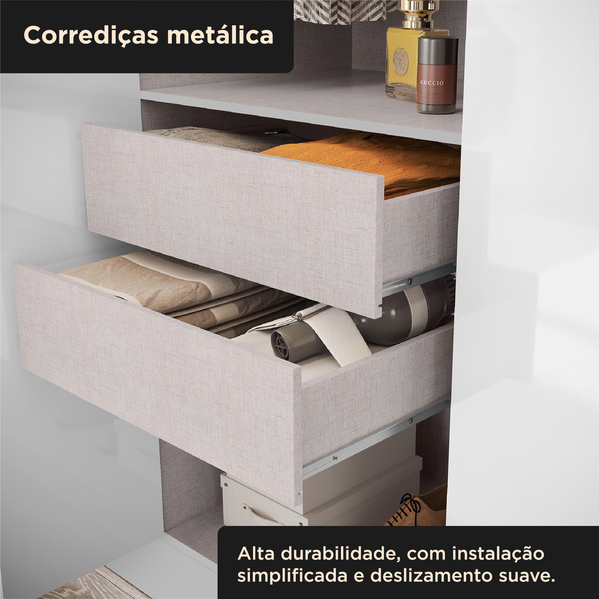 Com 6 portas, 2 gavetas espaçosas, diversas prateleiras e dois cabideiros, sendo um com mais de 1,10 metro e o outro com 0,56 metro, o guarda-roupa Gliese tem todas as características essenciais para tornar seu quarto mais funcional e organizado.