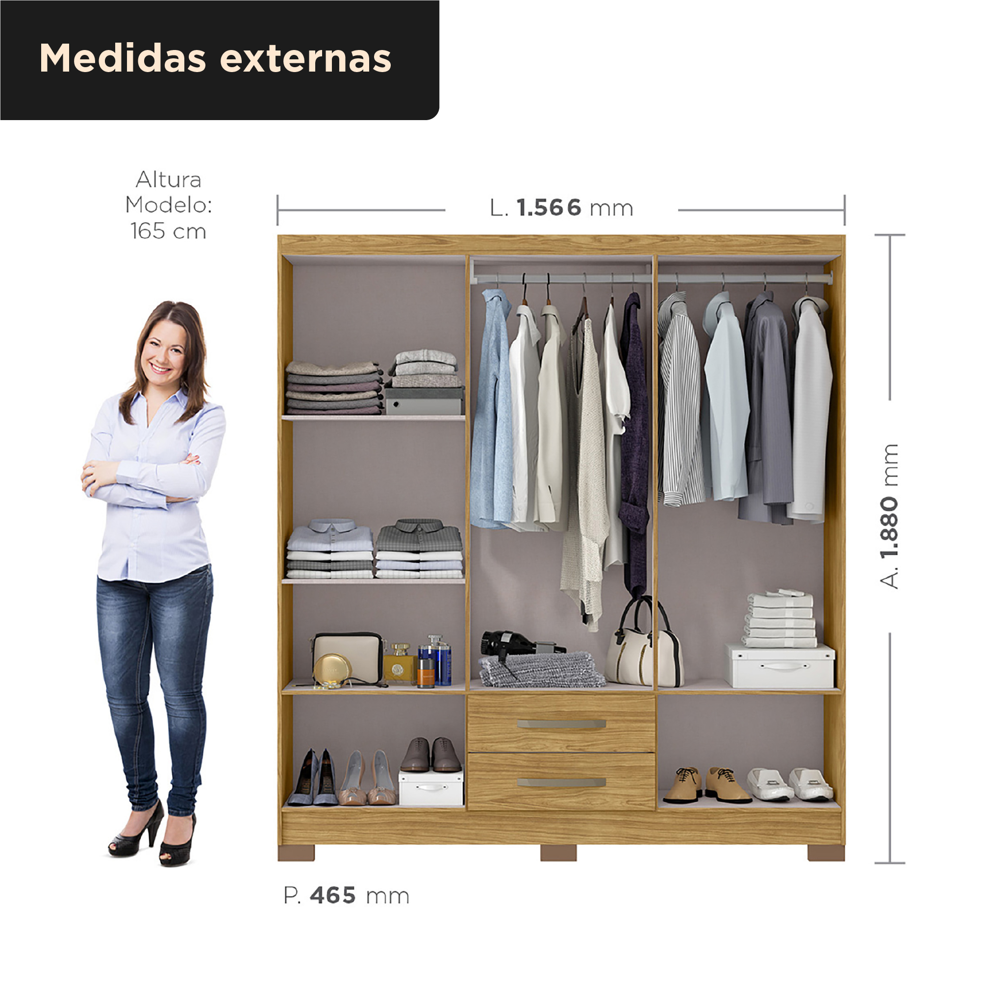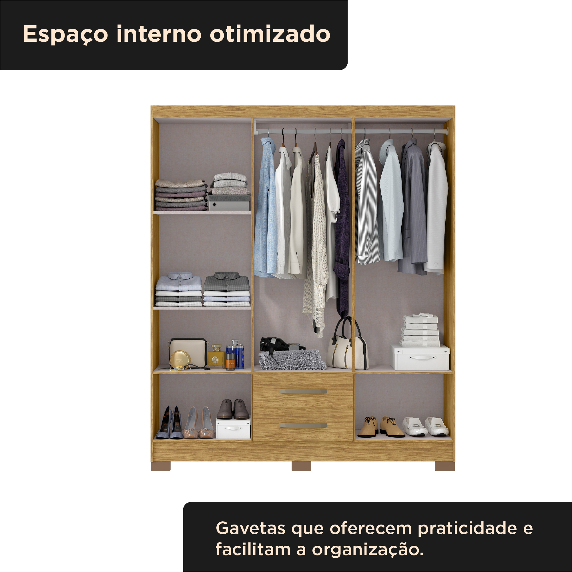Este produto é a escolha perfeita para quem procura um guarda-roupa com espaço amplo e bem dividido, contando com diversas prateleiras, duas gavetas e um amplo cabideiro.