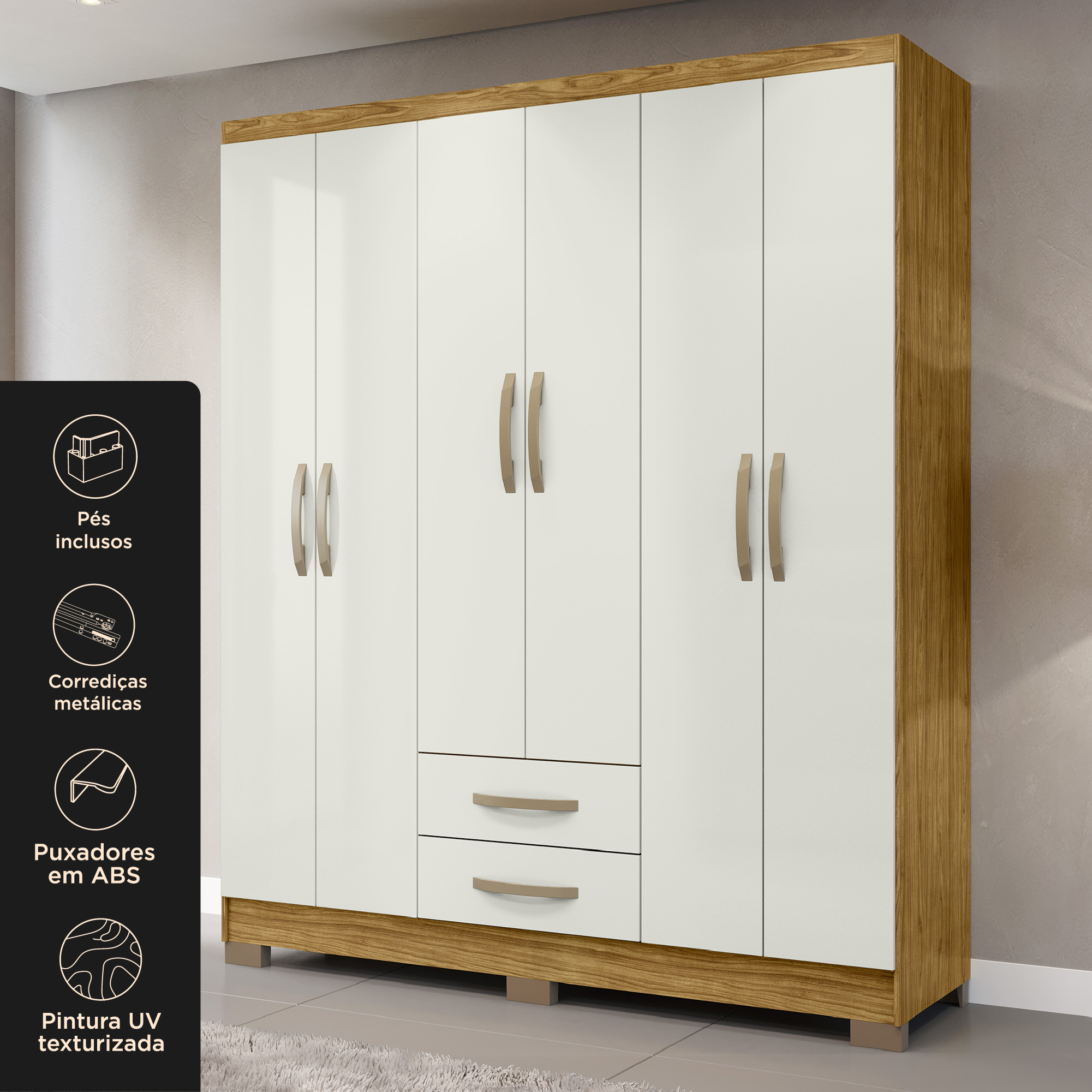O guarda-roupa Santiago 6 portas é produzido com material de alta qualidade, o que garante uma estrutura rígida, complementada pelo acabamento em PINTURA UV TEXTURIZADA 3D, que protege as peças e traz mais personalidade e estilo para o seu ambiente.