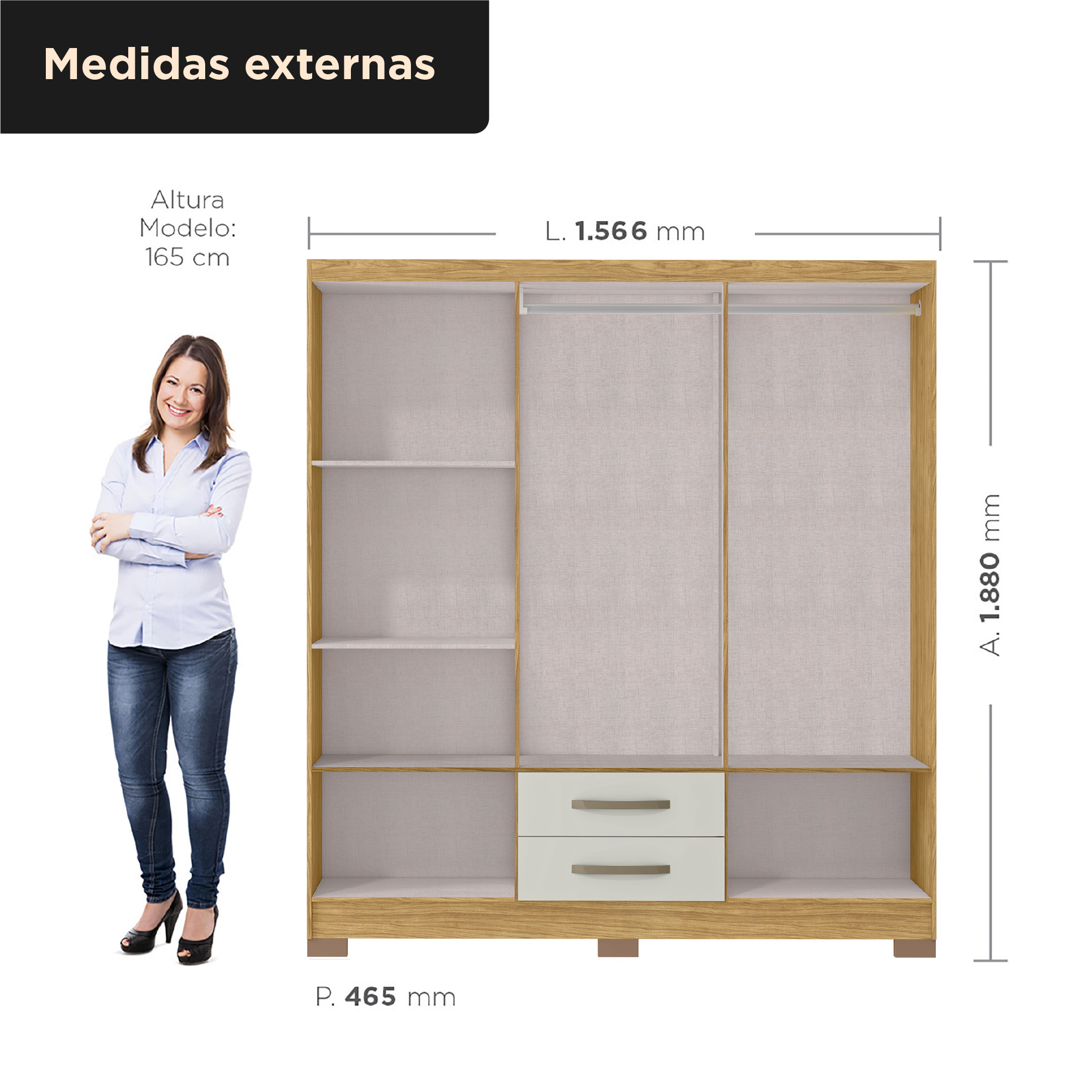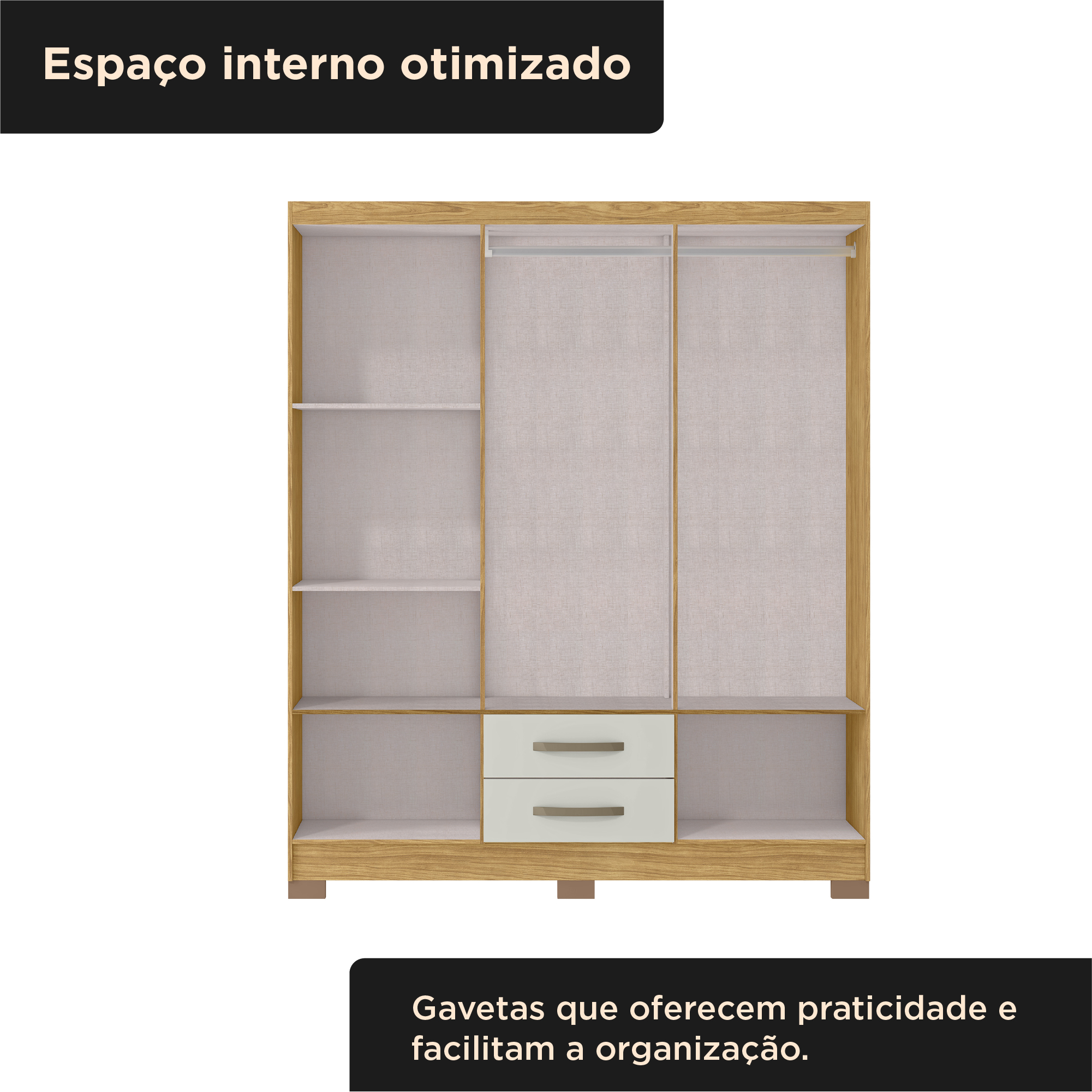 Este produto é a escolha perfeita para quem procura um guarda-roupa com espaço amplo e bem dividido, contando com diversas prateleiras, duas gavetas e um amplo cabideiro.