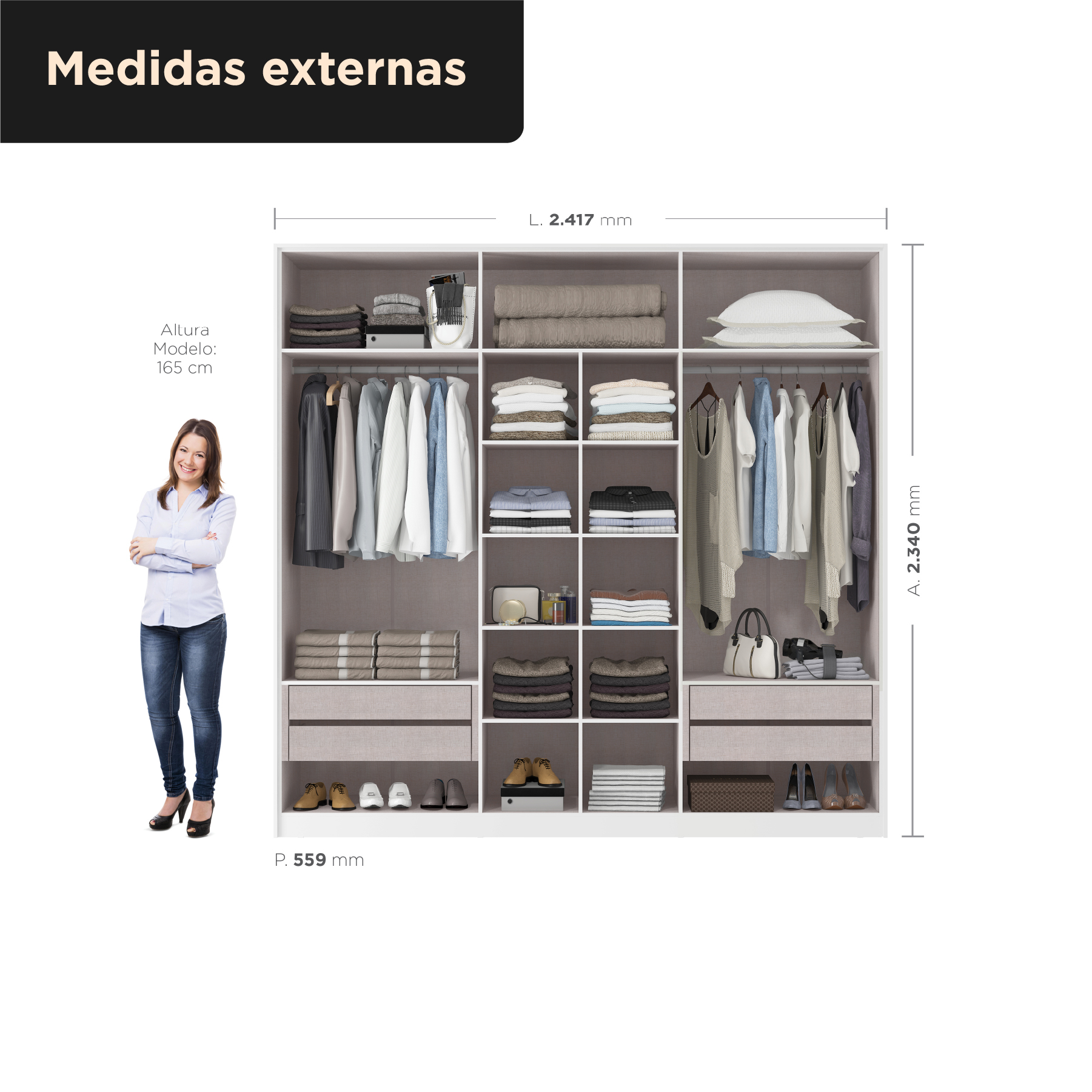 O guarda-roupa Barcelona é a escolha ideal para quem busca amplo espaço interno, organização e sofisticação. Com design moderno e dimensões maiores que o convencional, ele oferece excelente capacidade para armazenar roupas, calçados e acessórios de forma prática e funcional.