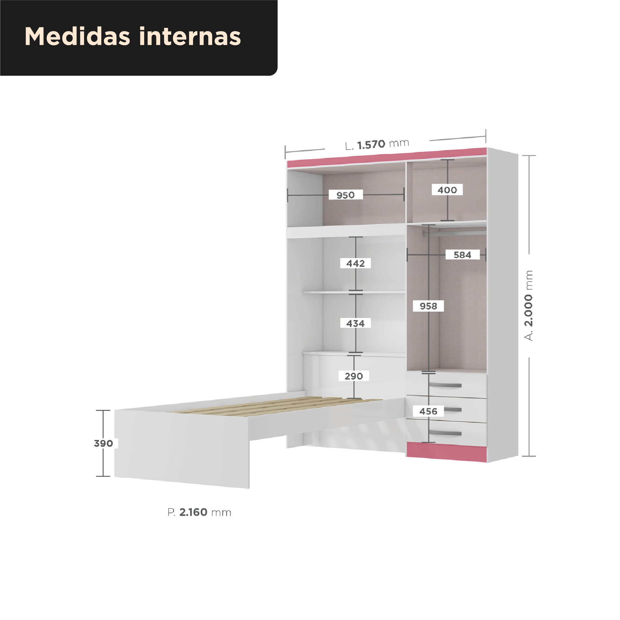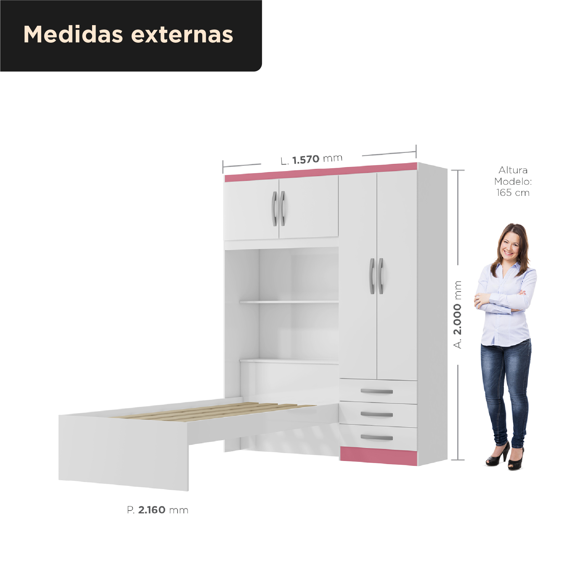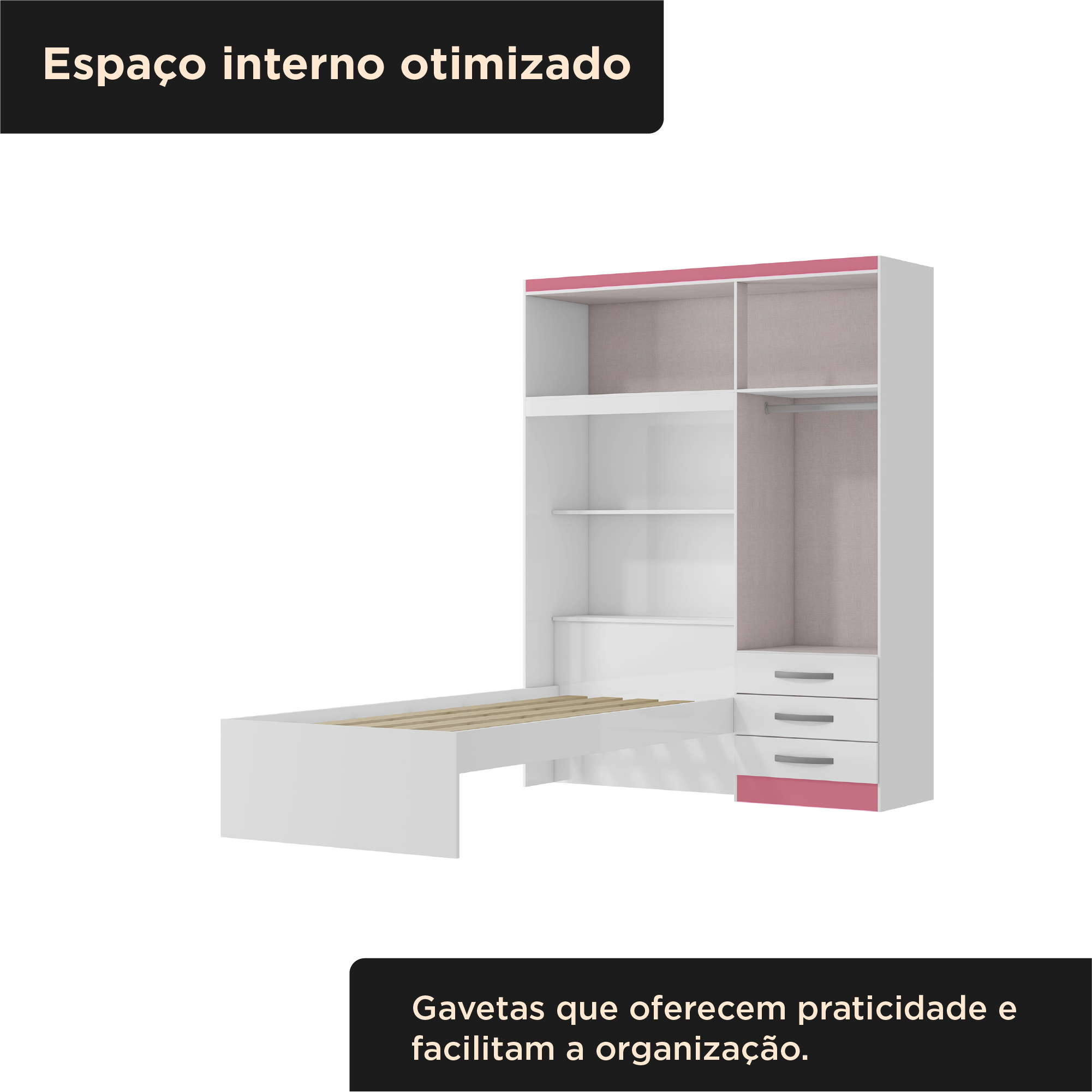 Guarda-roupa com cama e baú 4 portas 3 gavetas Lisboa - flex color - branco / rosa