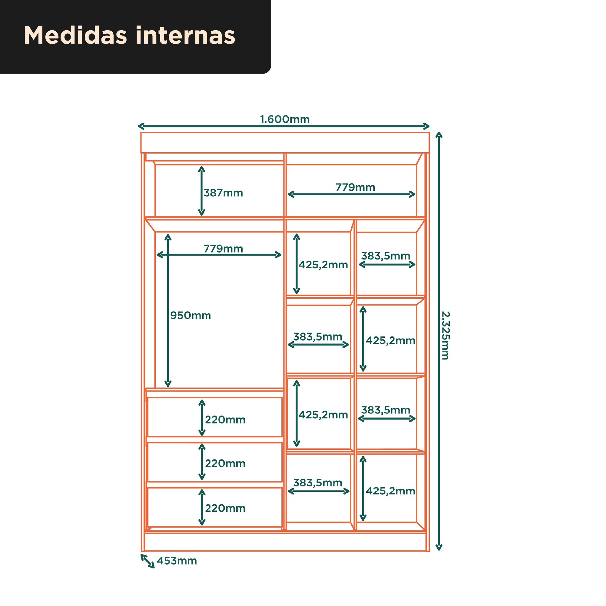 Com um design moderno, é diferente de tudo que você já viu. Além da parte externa sofisticada e cheia de identidade, o guarda-roupa Bagdá possui um dos lados com divisórias em formato de colmeia, ideal para quem gosta de muitas prateleiras, facilitando a organização.