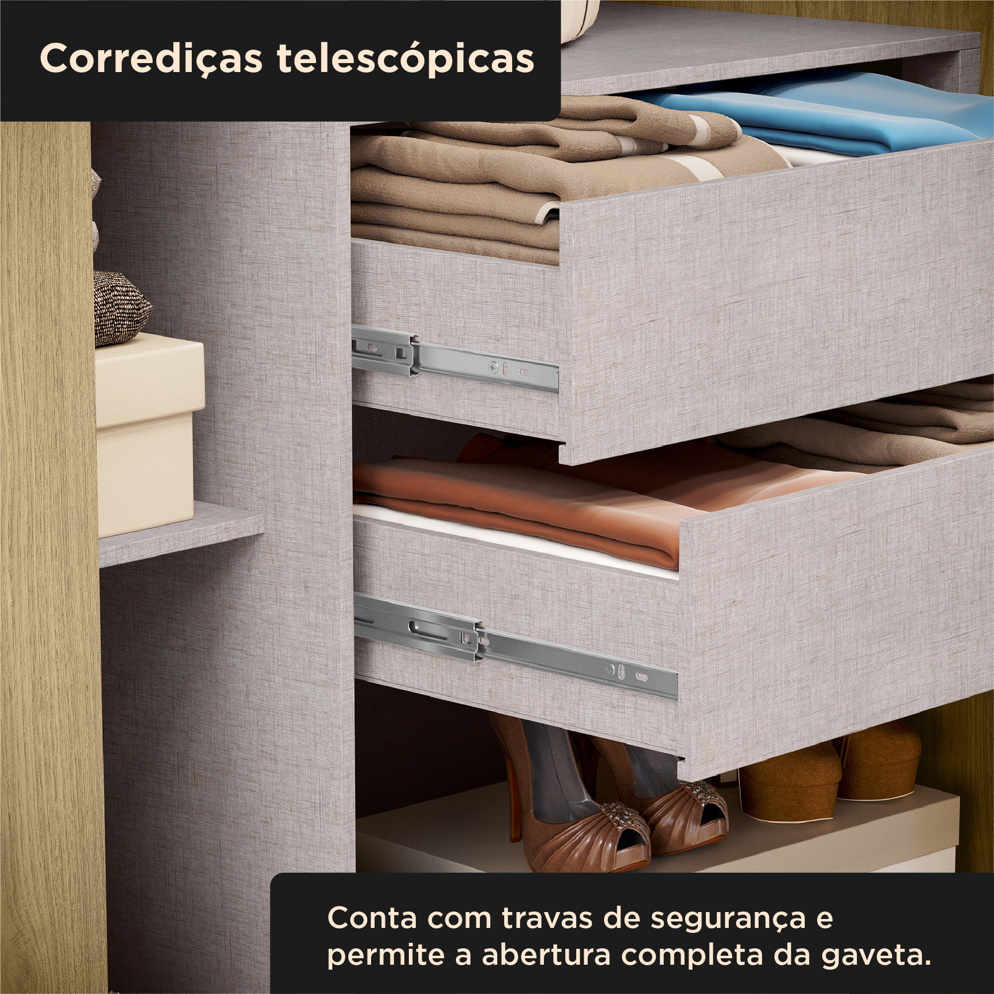 O destaque deste produto está nos puxadores Cava embutidos, usinados diretamente nas peças, e nas portas, sendo uma de correr e duas de bater, deixando o design clean e moderno, trazendo personalidade para o seu quarto.