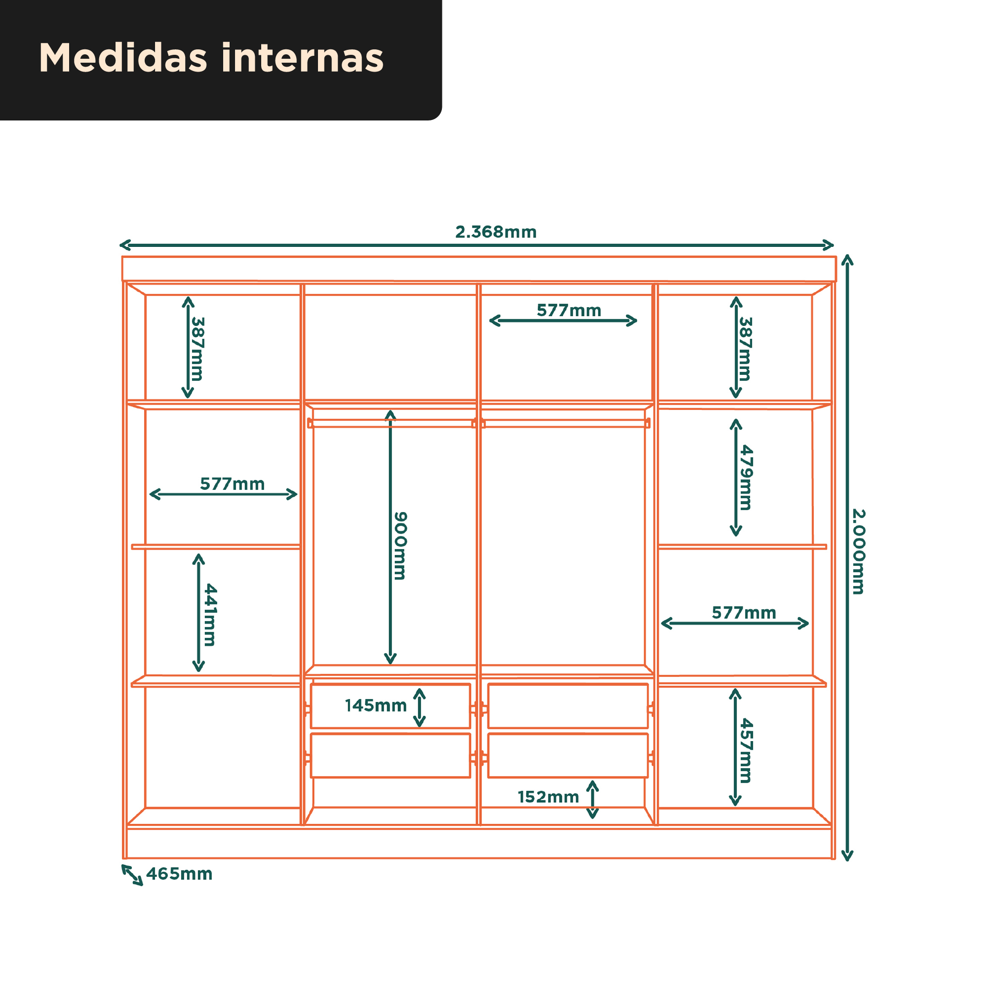 O guarda-roupa Tauri é uma escolha assertiva para quem divide o espaço e possui muitos itens e roupas para guardar. Com 4 gavetas espaçosas, 8 portas, diversas prateleiras e um cabideiro que se estende pelas 4 portas centrais, facilita o compartilhamento e a organização.