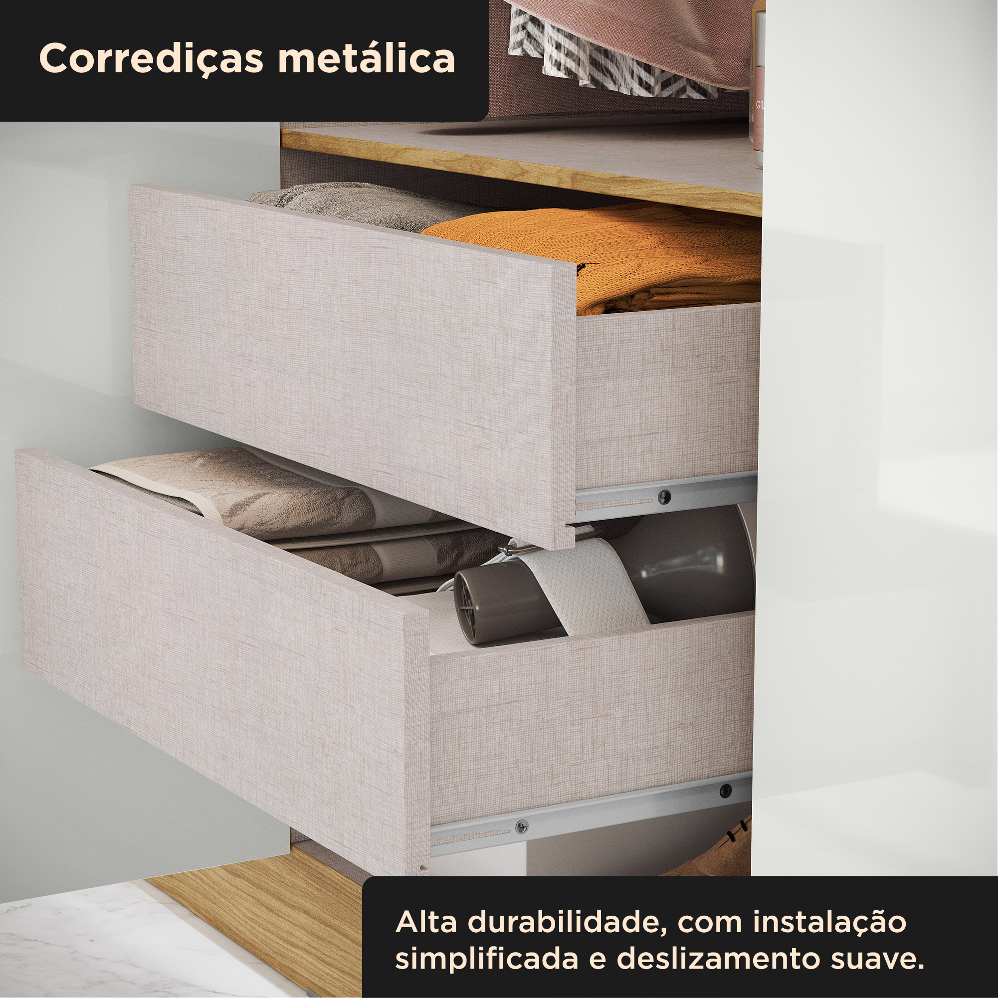 O guarda-roupa Tauri é uma escolha assertiva para quem divide o espaço e possui muitos itens e roupas para guardar. Com 4 gavetas espaçosas, 8 portas, diversas prateleiras e um cabideiro que se estende pelas 4 portas centrais, facilita o compartilhamento e a organização.