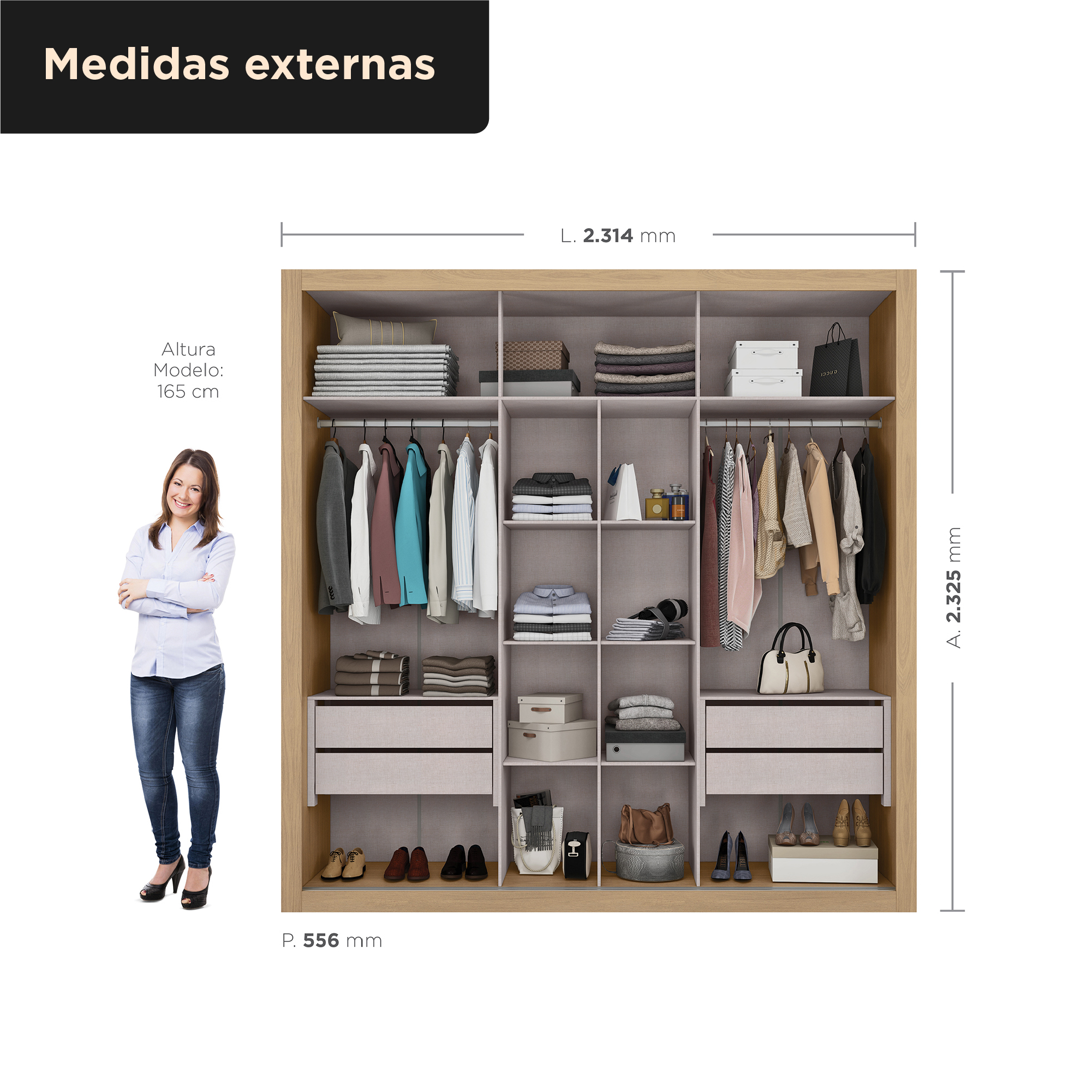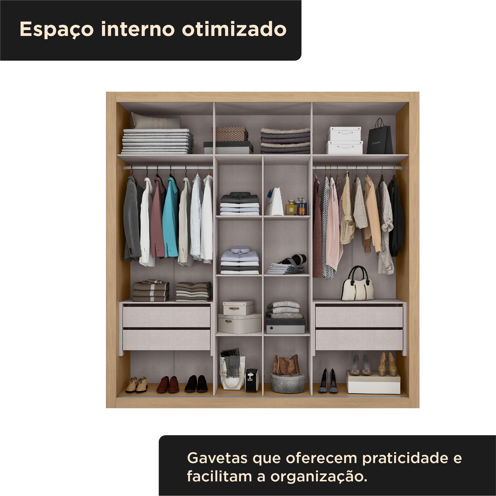 Fabricado 100% em MDF, o guarda-roupa Trípoli une imponência e sofisticação, com uma estrutura robusta e materiais de alto padrão. Sua divisão interna refletida e medidas foram cuidadosamente desenvolvidas para atender às necessidades da sua casa, facilitando a organização e o uso diário.