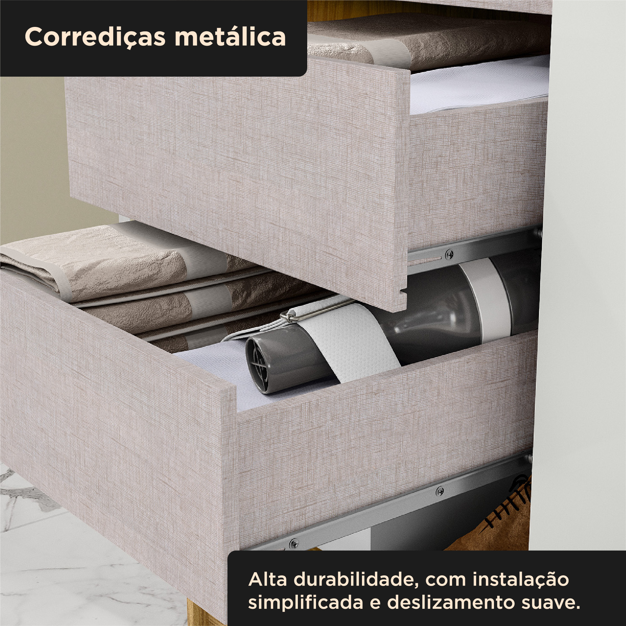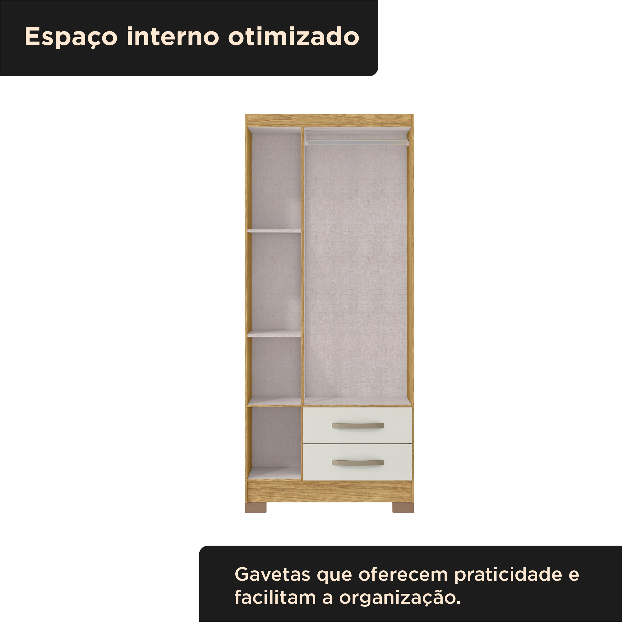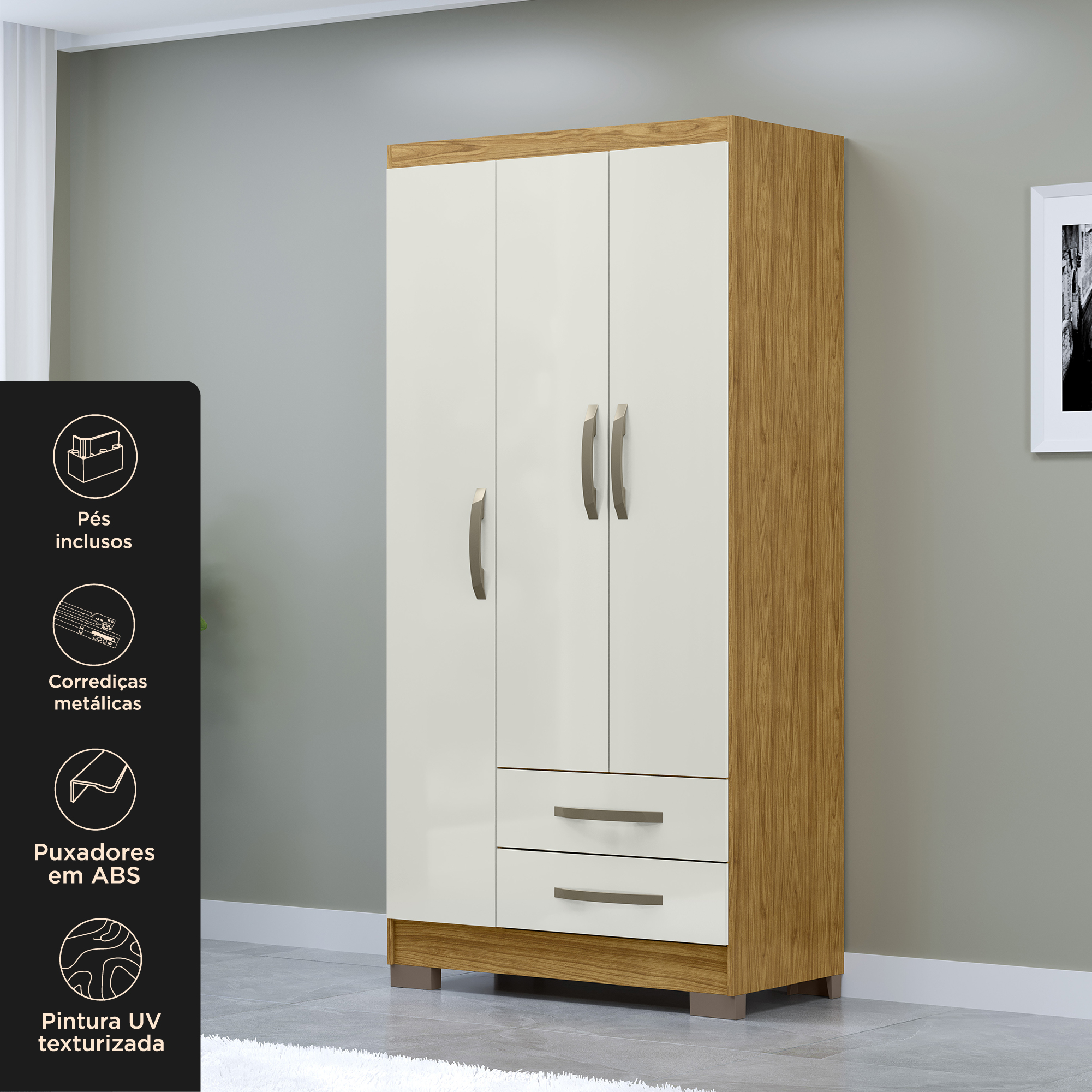 O Santiago 3 portas conta com duas gavetas grandes, diversas prateleiras e um cabideiro feito para todo tipo de roupas, camisas ou vestidos.